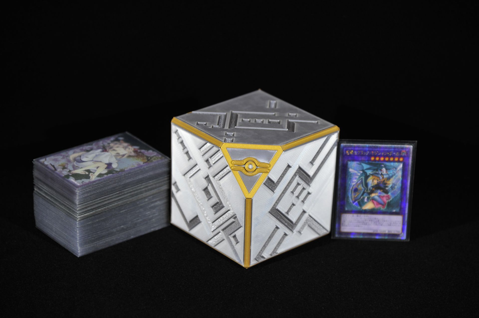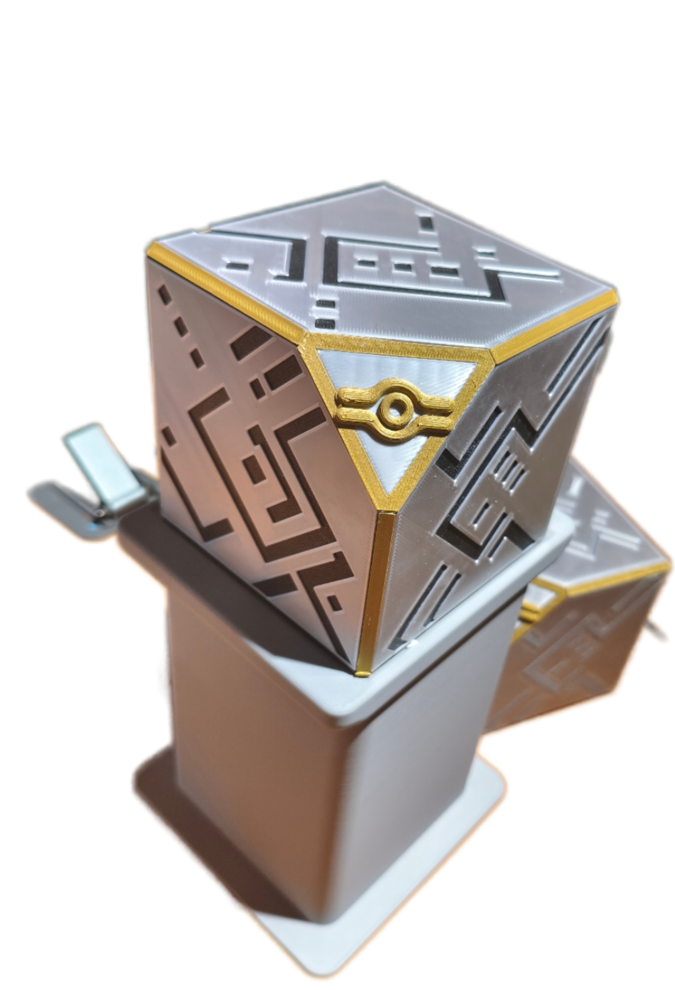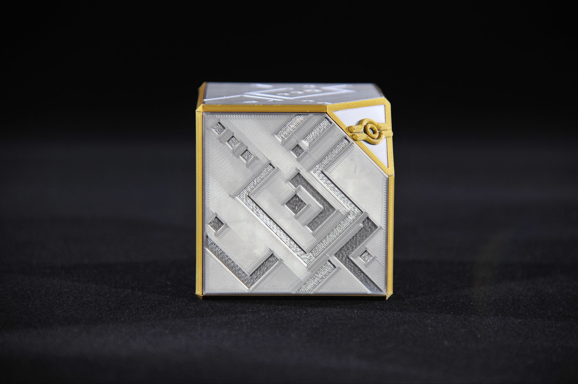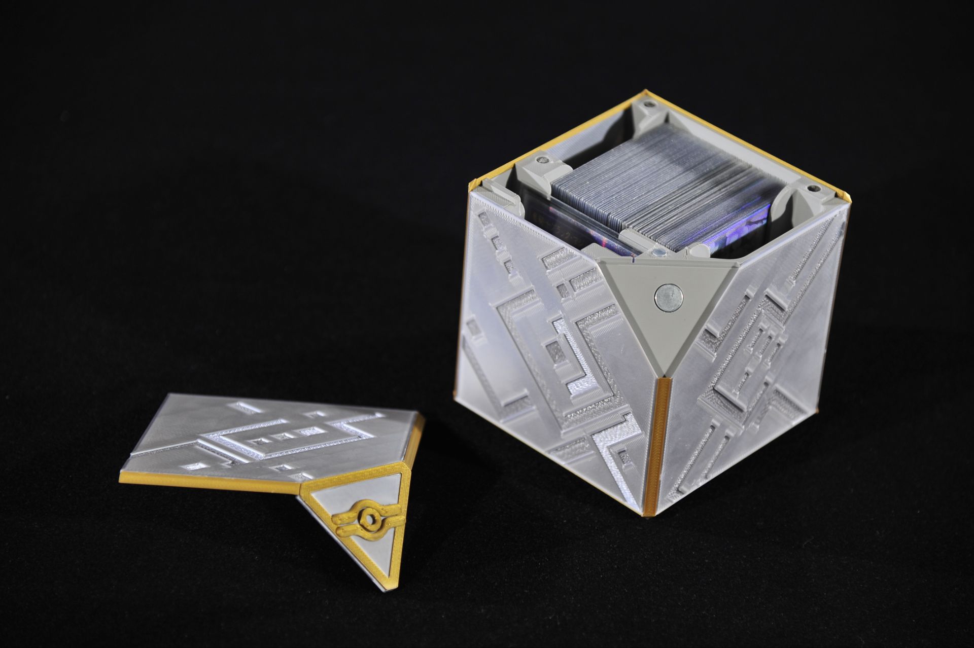 创意作品千年盒子主题卡盒;银色PLA、黑/金PETG 多材料;2025年6月完成。作品展示: 作品来源卡牌游戏的相应主题卡盒。2025年6月设计完成。制作方式FDM 打印机制作;银色 PLA + 黑色/金色 PETG 组合打印。